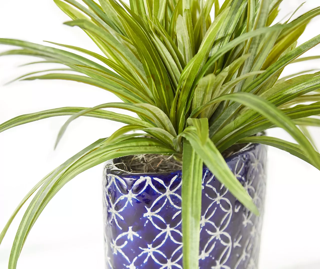 Add a touch of nature to your décor without the upkeep decorating with this artificial plant. Realistic blades of grass are featured in a moss-like bed. Residing in a decorative pot in white with a repeating floral pattern, this faux plant is perfect for decoration in an entryway or living space.