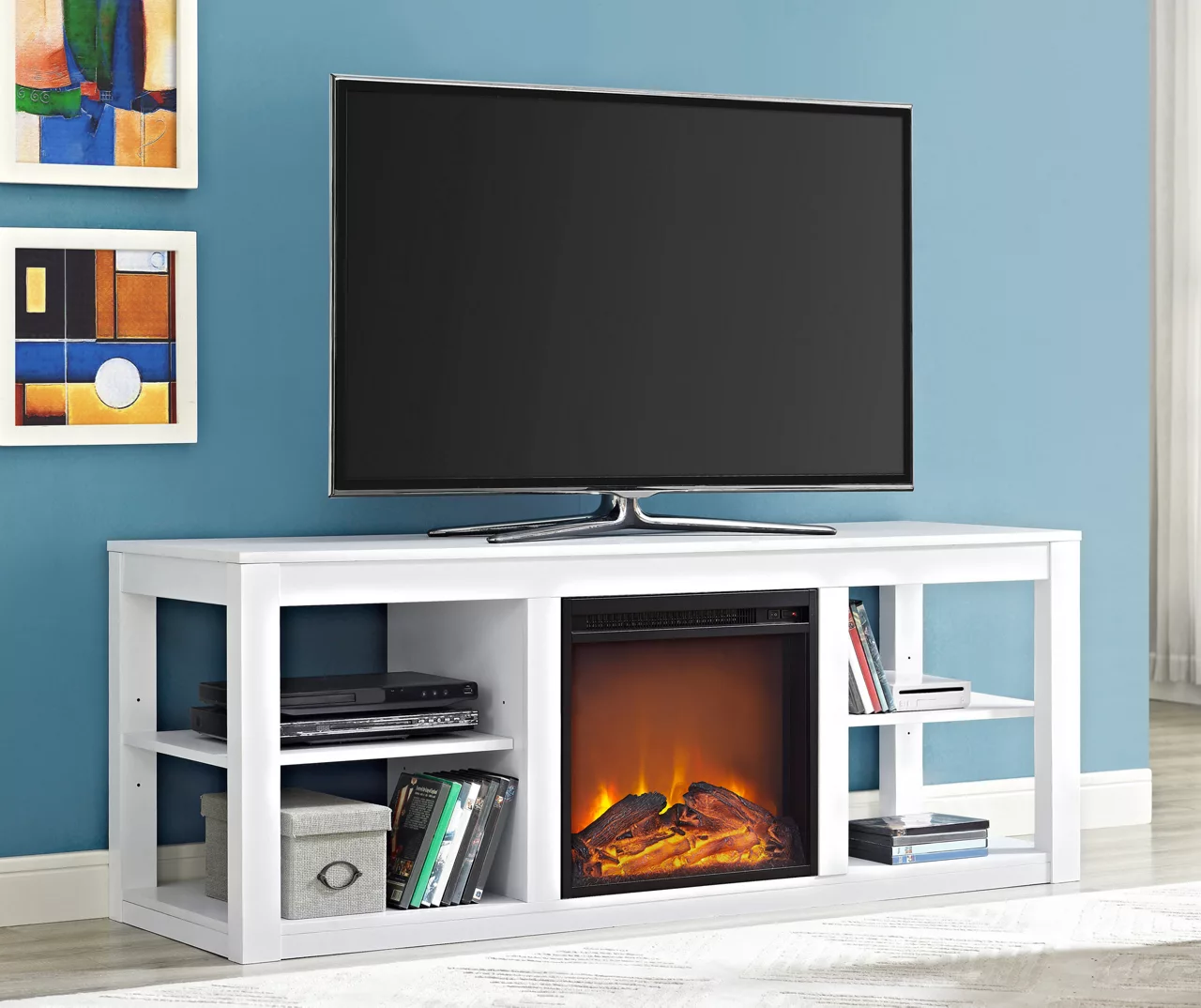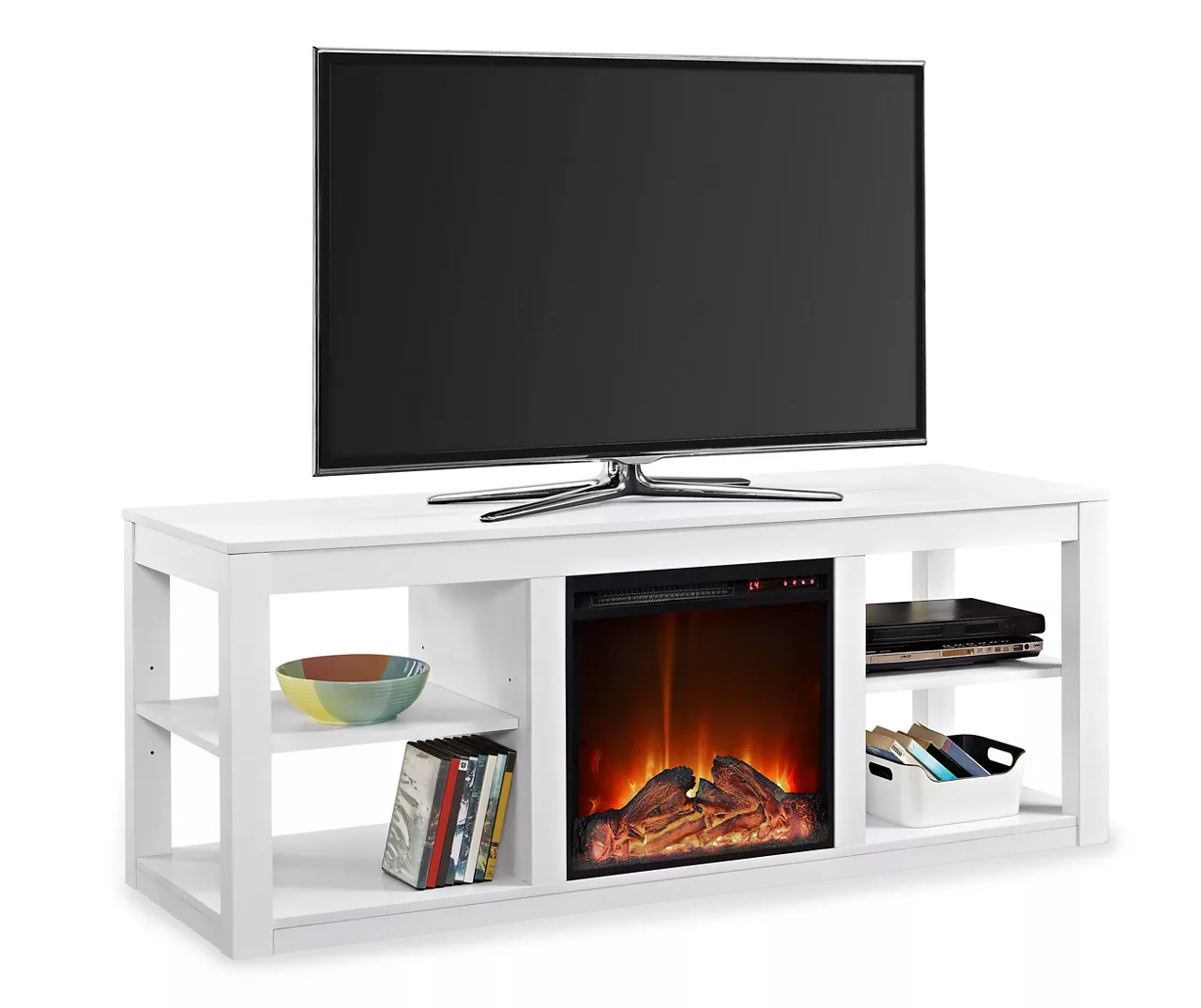 Add bold, contemporary design to your living room or family room using the Ameriwood Roxbury electric fireplace TV stand. A classic white finish creates an instant update to your entertainment space as classic slim parsons styling is carried throughout its design creating four large open compartments for your cable box, DVD Player, and audio equipment. The highlight of this TV Stand is the AltraFlame fireplace insert that features a realistic glow using LED lights for an authentic fireplace effect without all of the maintenance. Use this fireplace to warm up a room or just turn on the flames without the heat and enjoy the beauty even in the summer.