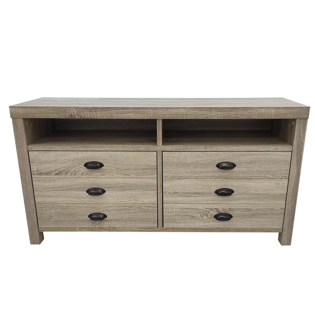 Bring style and organization to your living room with this multi-drawer TV stand from Real Living. Two doors with false drawer fronts and cup-style handles keeps items concealed behind hidden shelving as two spacious open cubbies offer space for media equipment. Finished in a weathered light brown, driftwood-inspired look, this TV stand brings form and function to your entertaining needs.