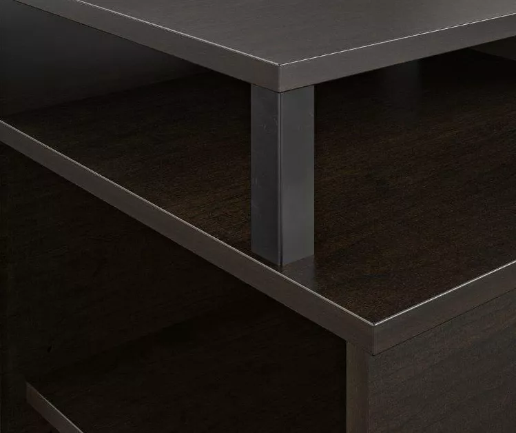 - Made of laminated particleboard and powder-coated metal, the espresso finish and contrasting black base and accents give this stand a distinct look