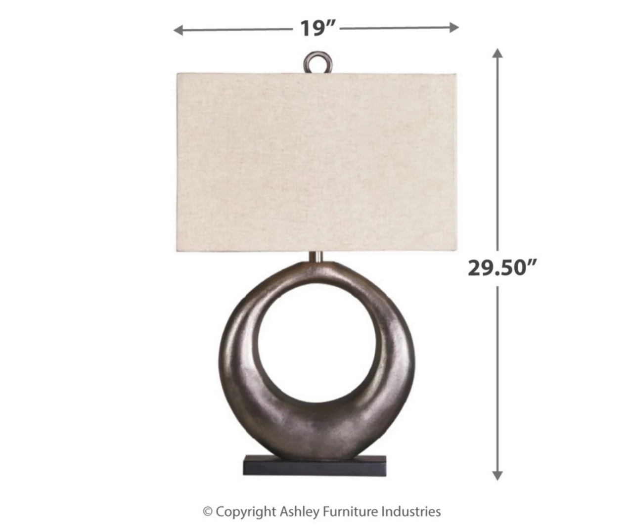 Update your home with the modern vibes of this unique table lamp supported by an open, rounded sculpture-style base. A dimmer and 3-way switch let you control the ambient lighting in your space.