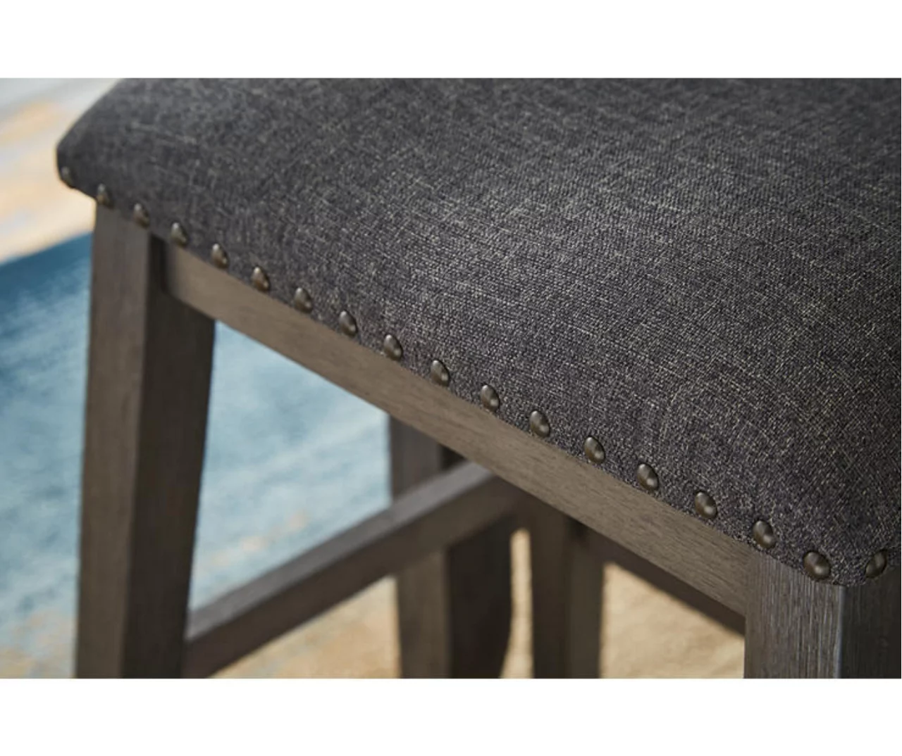 - Foam cushioned saddle bar stools with textured gray upholstery