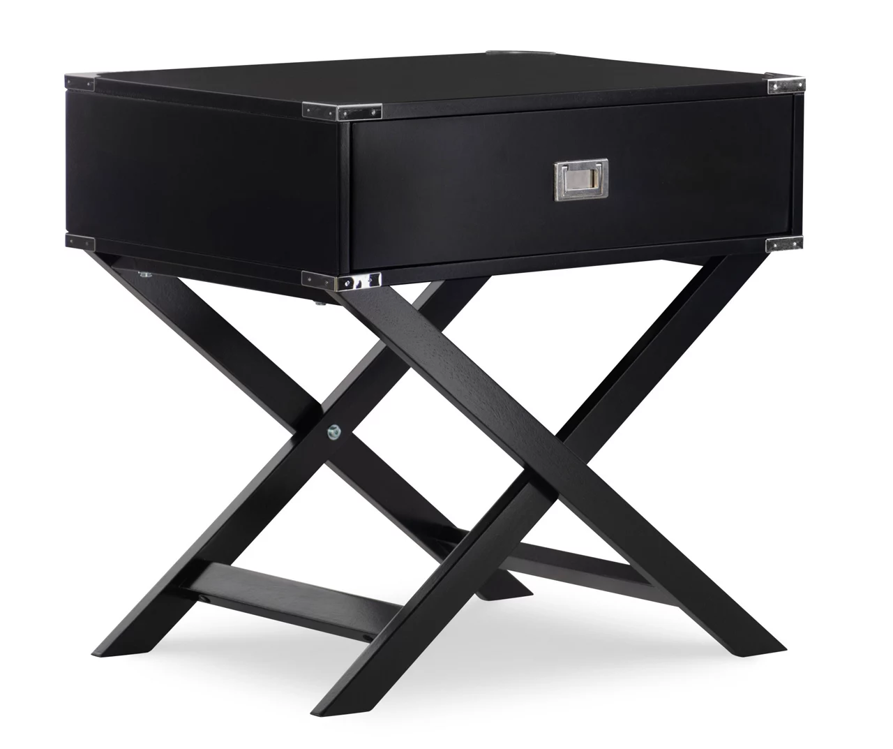 Refresh your home with the crisp lines of this eye-catching accent table. With its unique X-shaped base, this piece brings a fun, geometric look to any room in your home. Add this piece beside a bed, chair or in an entryway to enjoy its spacious storage and display space. Metallic accents accent the neutral finish with gleaming shine.