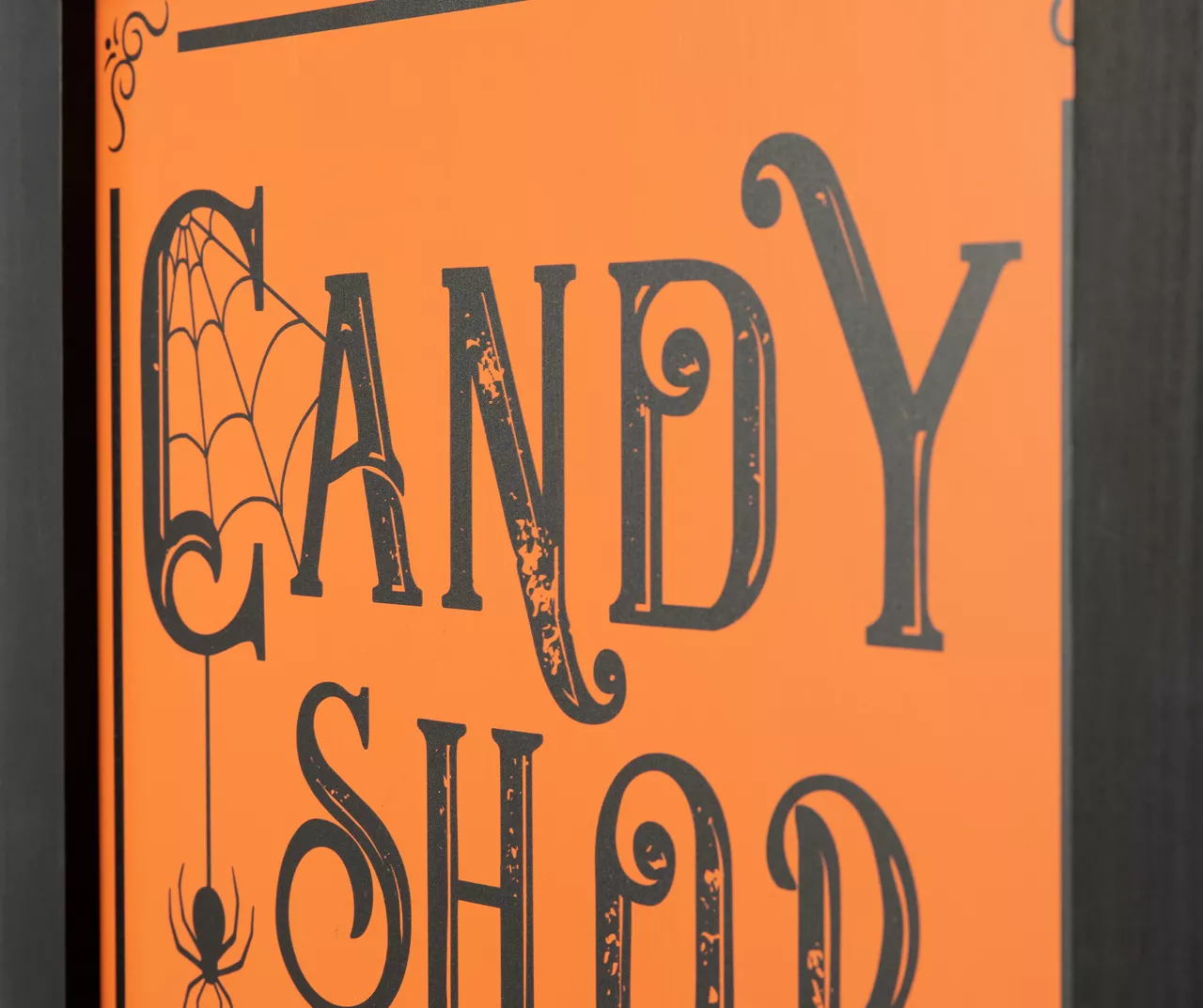 Decorate your porch or front door with this Halloween Standing Easel Sign Decor. “Candy shop” is written down the orange panel front as well as sharing greetings to costumed candy seekers. Finished in a contrasting black easel frame, this piece is a charming addition to your Halloween celebrations.