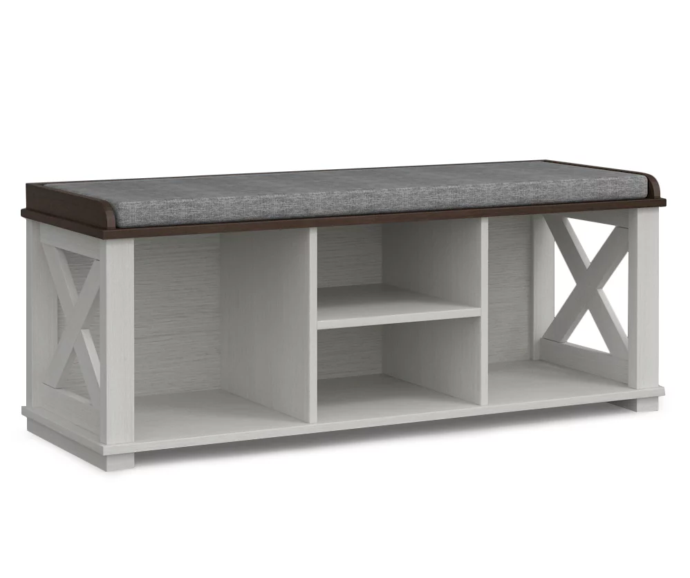 Bring convenience and storage to an entryway, foyer or mudroom with the Stratford bench. It features a farmhouse-meets-modern design with a two-tone white base and a dark brown finish top. Lower cubbies and shelving offer a place to store shoes and accessories as you sit on the cushioned gray seat on your way out the door.