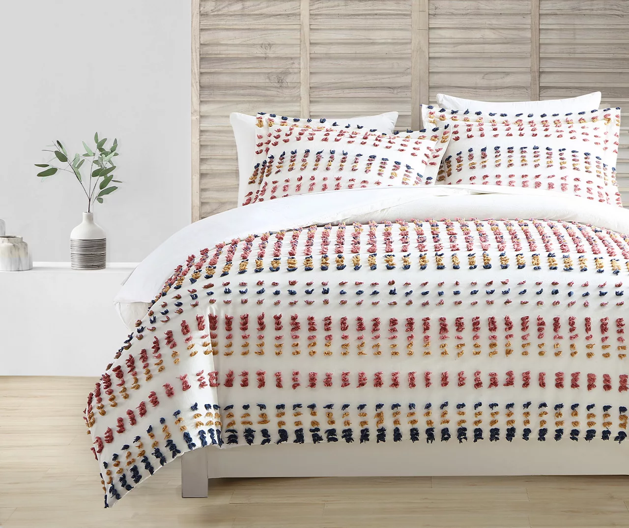 Eye-catching rows of multi-color tufts add a delightful touch of playful boho flair to this soft comforter set. Crafted from breathable cotton, this bedding set offers year-round comfort and brings modern appeal to any sleep space.