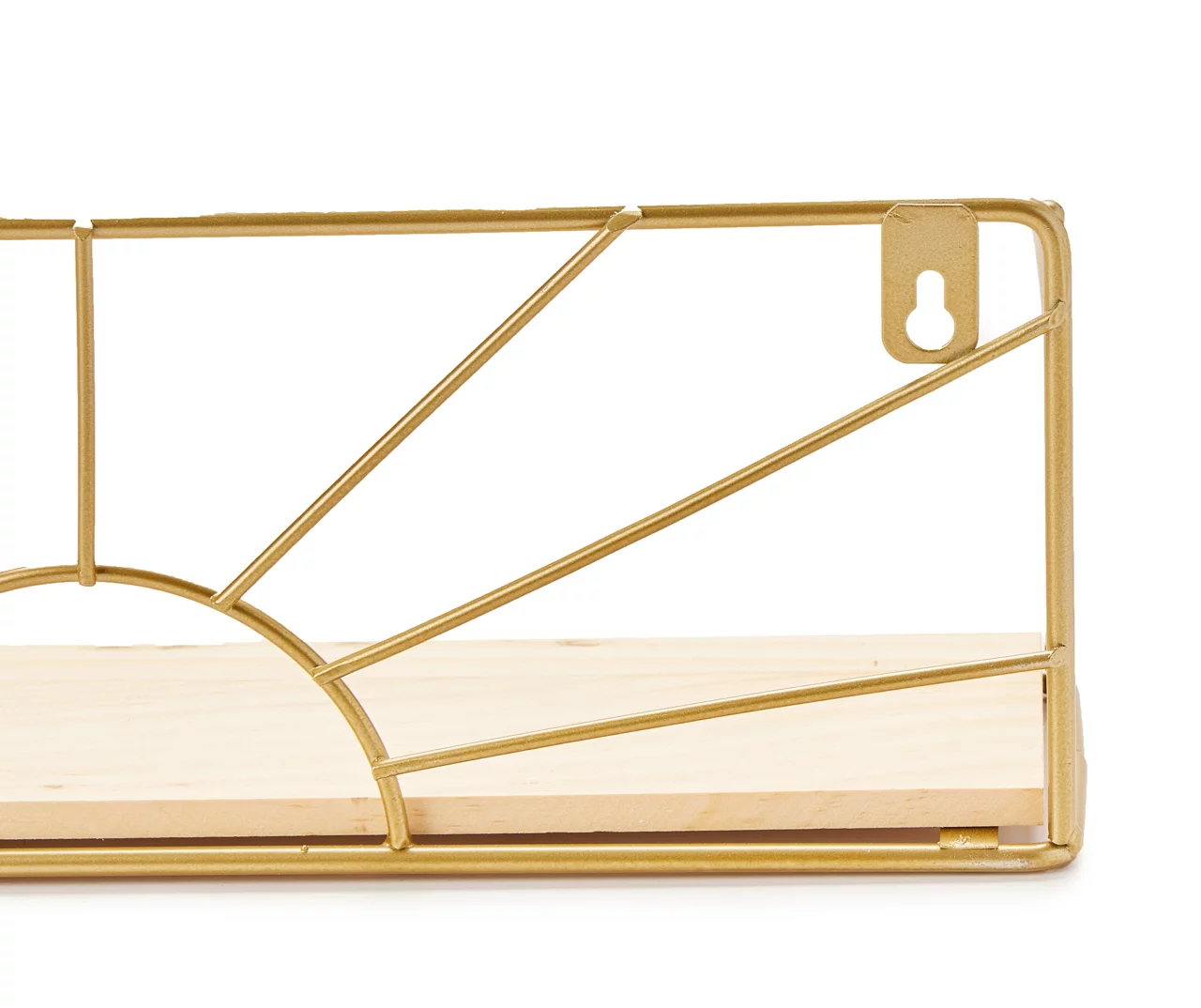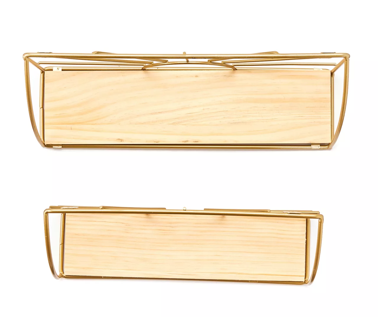 Create more storage and display space in your home while adding a touch of contemporary-chic style to your walls with this set of wall shelves. Each is defined by a golden open metal sun frame design and a wooden base, while keyholes on the back make them quick and easy to install.