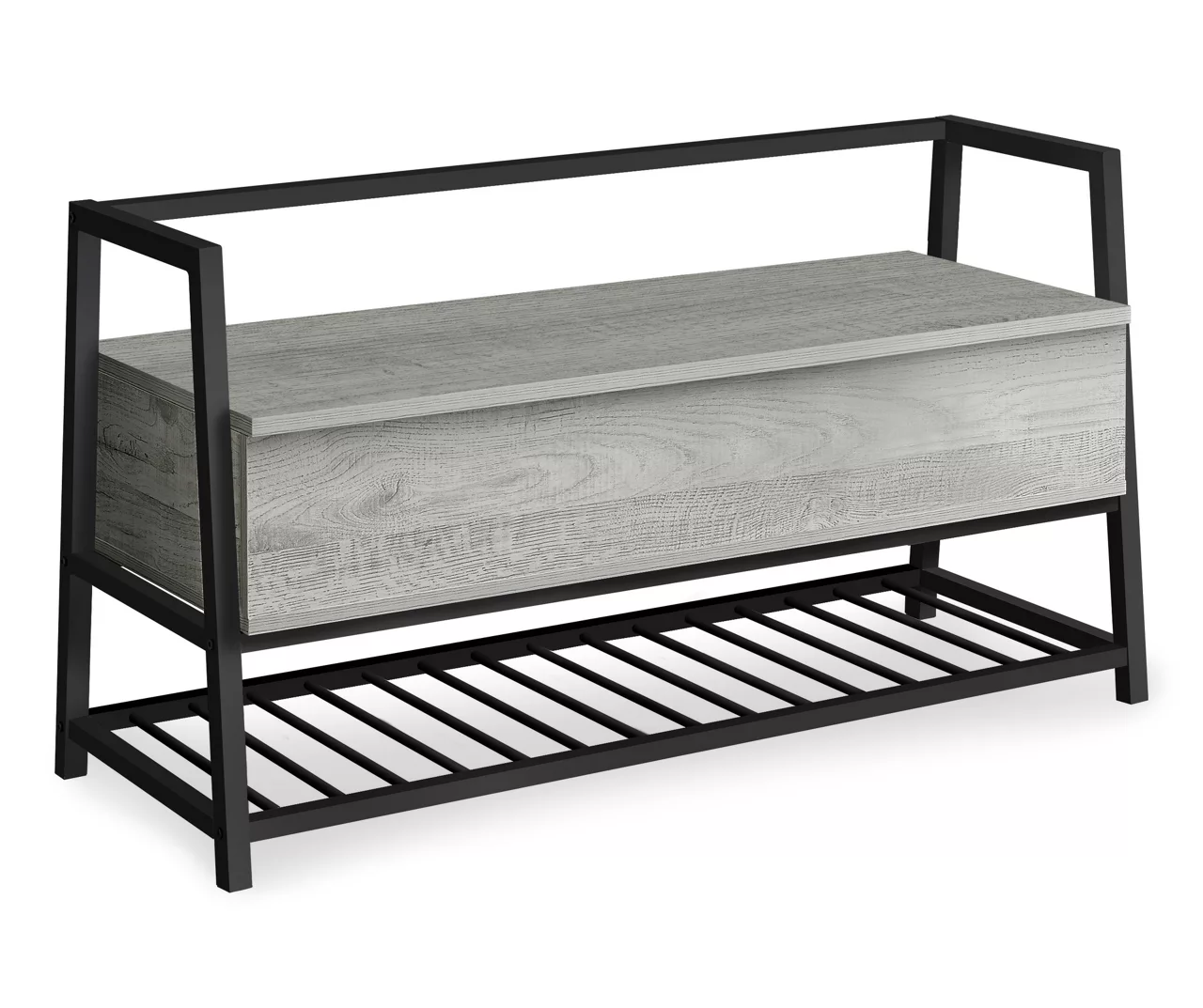 Keep your entryway or hallway clutter free with this versatile storage bench. The hinged top lifts to reveal a spacious interior storage cabinet as a shelf underneath neatly organizes shoes or other items. Conveniently sized and big in functionality, this storage bench in a gray wood-look finish with a black metal frame is brimming with style and substance.