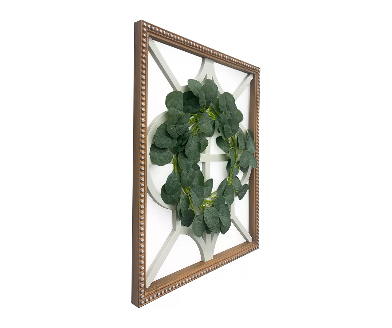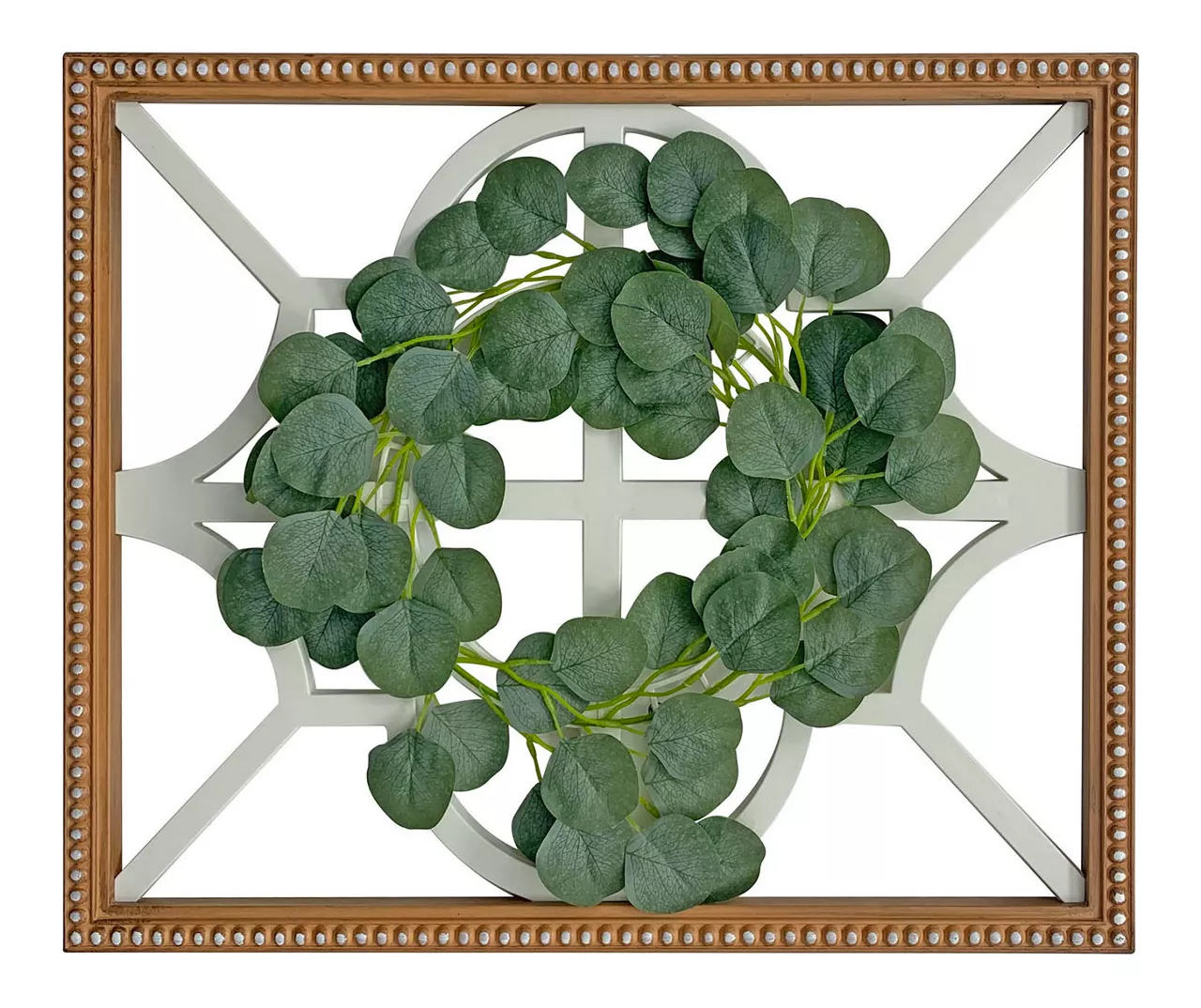 Add a unique look to your home decorating with this framed wall décor. A round greenery wreath displays in the center of a gray quatrefoil cut-out design that’s showcased in a beaded frame.