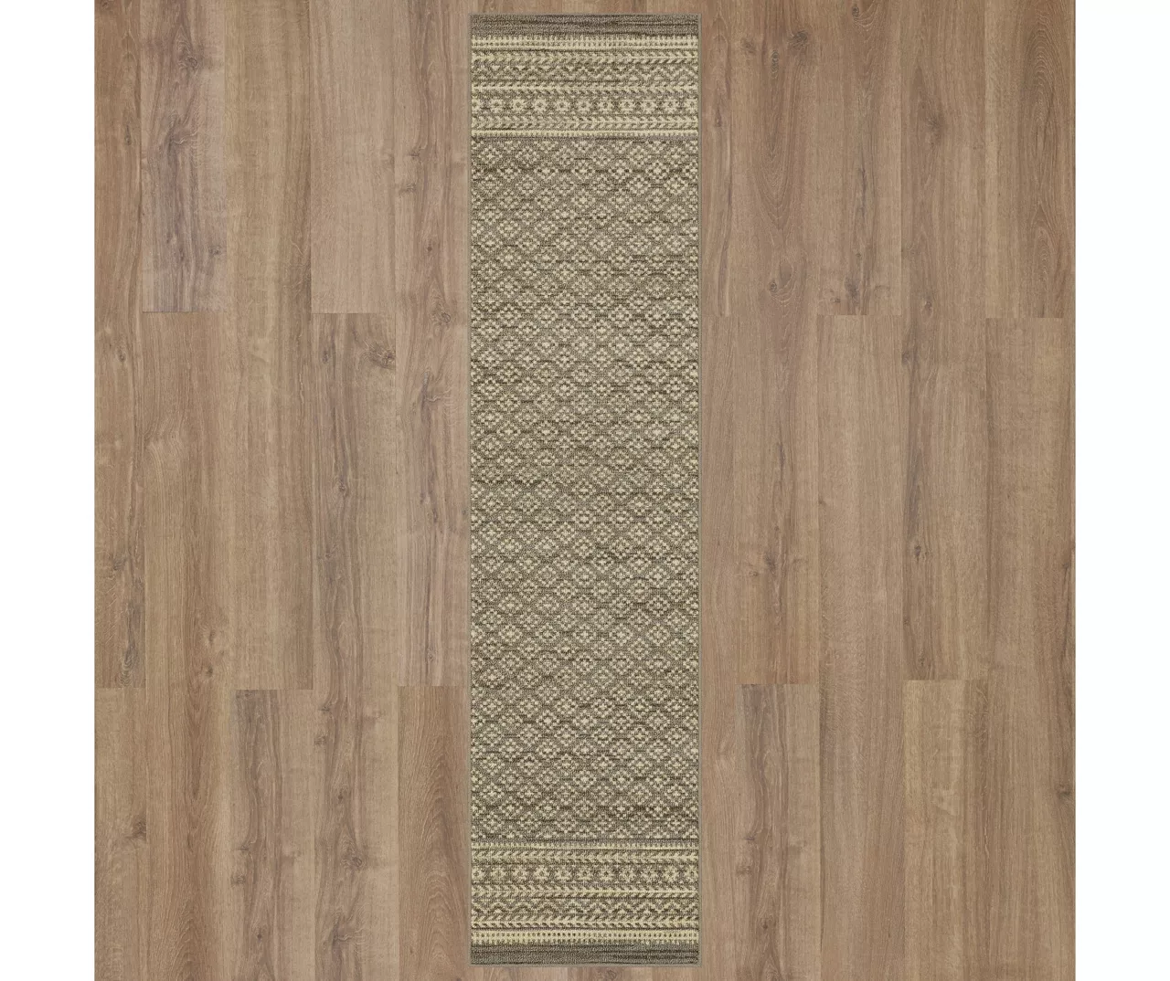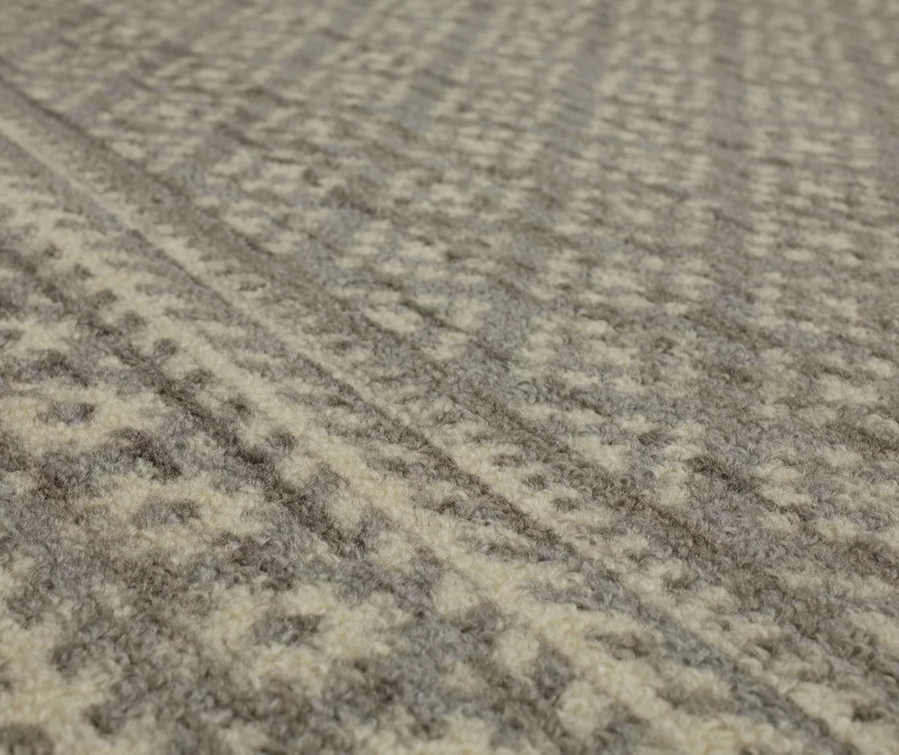 - Intricate geometric pattern and bordering in a neutral palette for a modern boho look