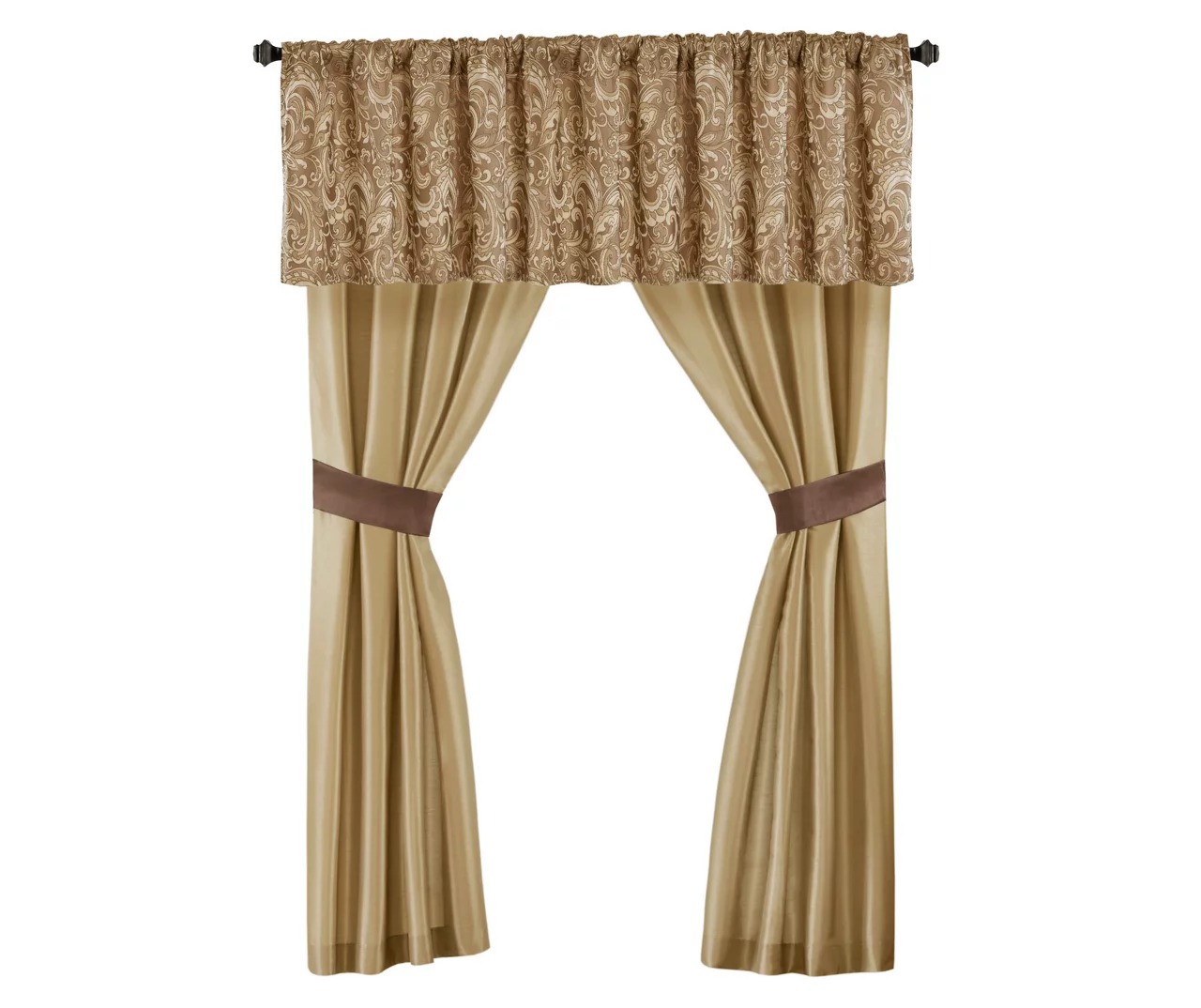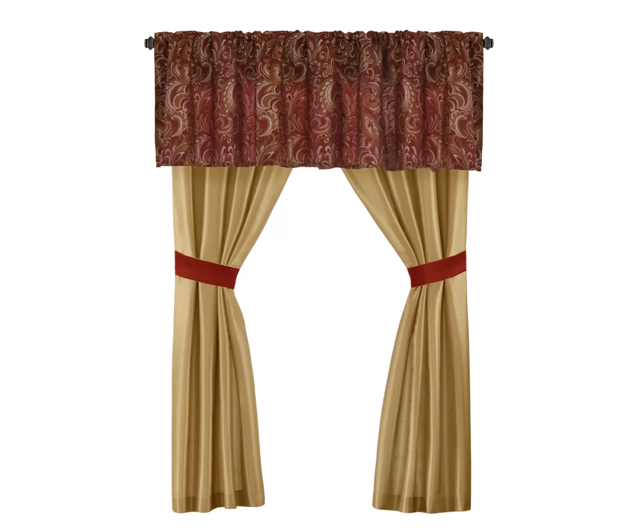 - Curtains come with coordinating tiebacks and valances