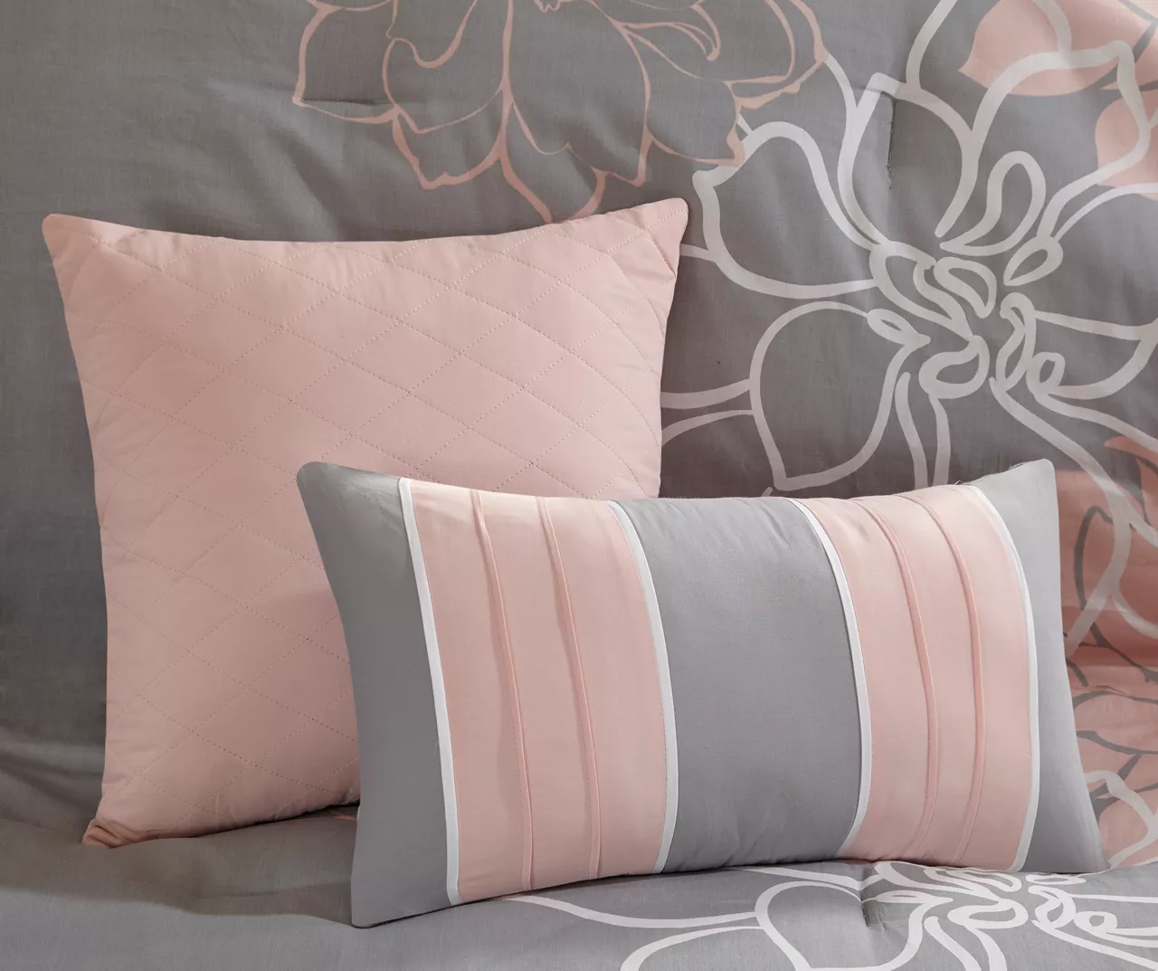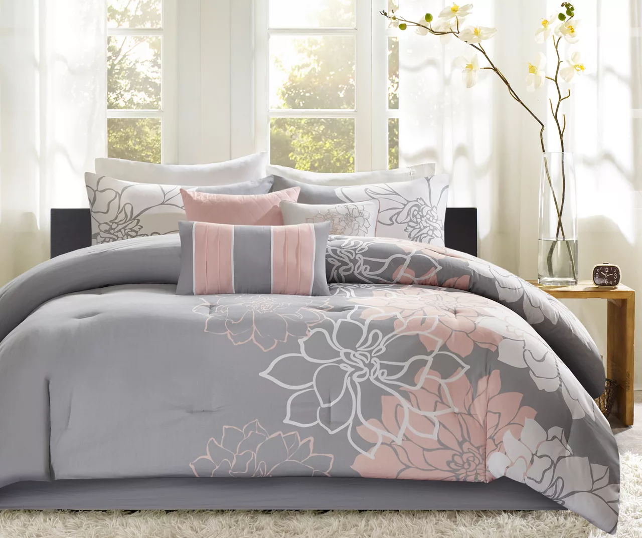 - Includes comforter, bed skirt, 2 shams and 3 decorative pillows