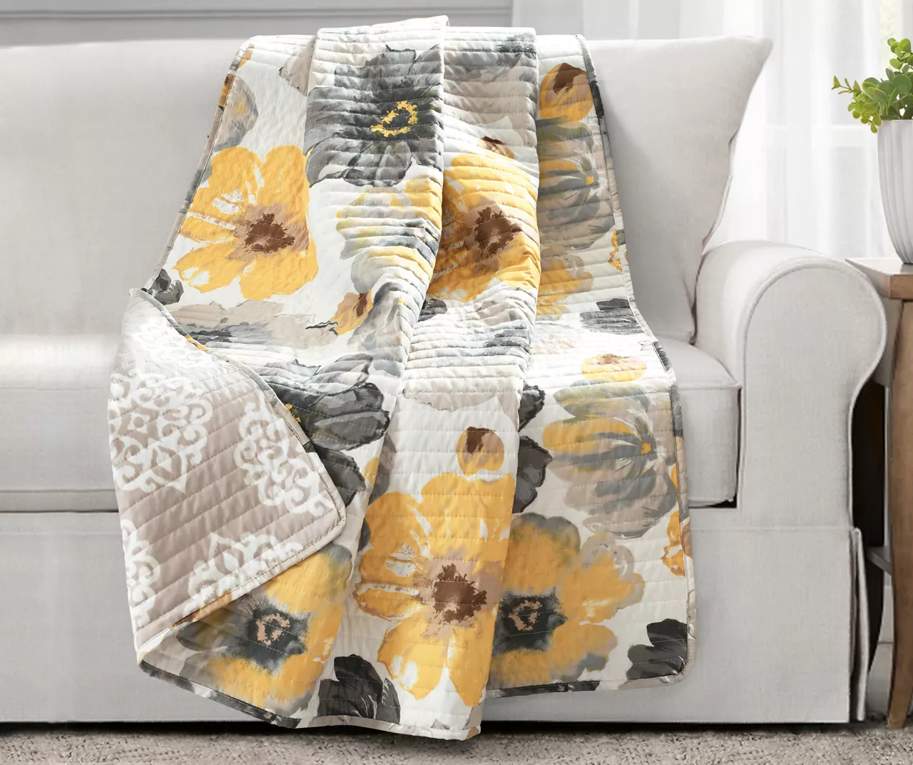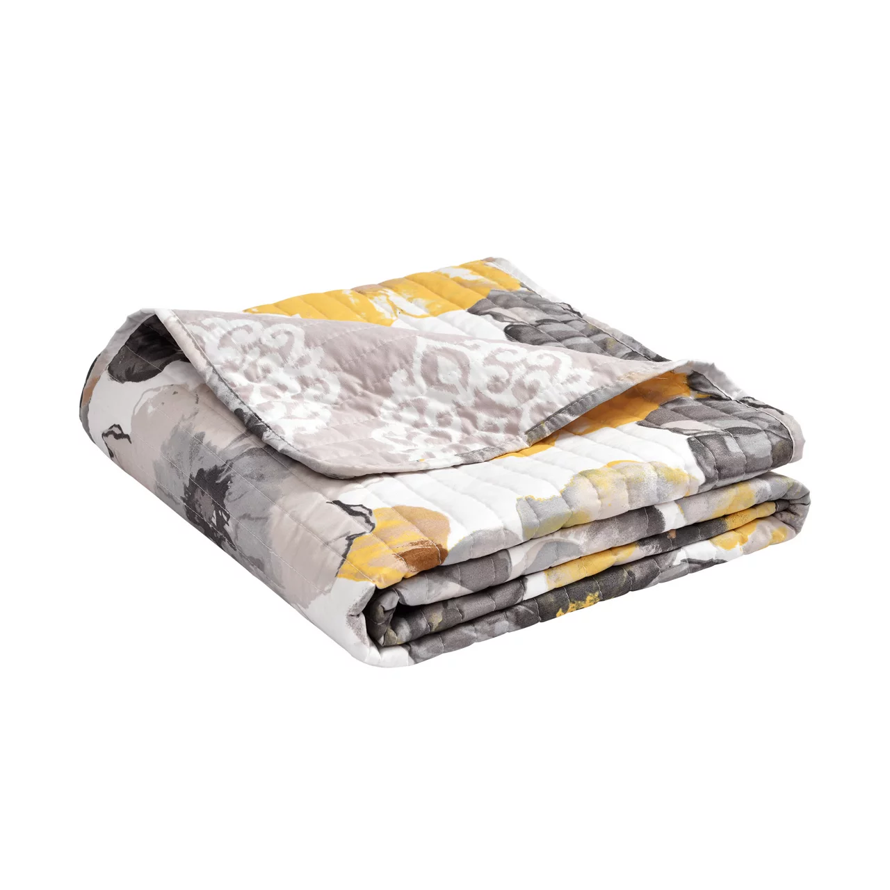 - Elegant watercolor-style floral print in soft gray and yellow hues