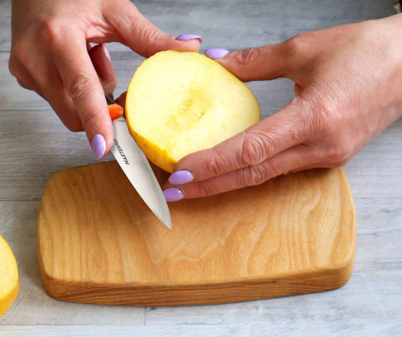 - Curved wider blade on the Chef’s Knife helps for easy rocking motion to finely mince herbs and food
