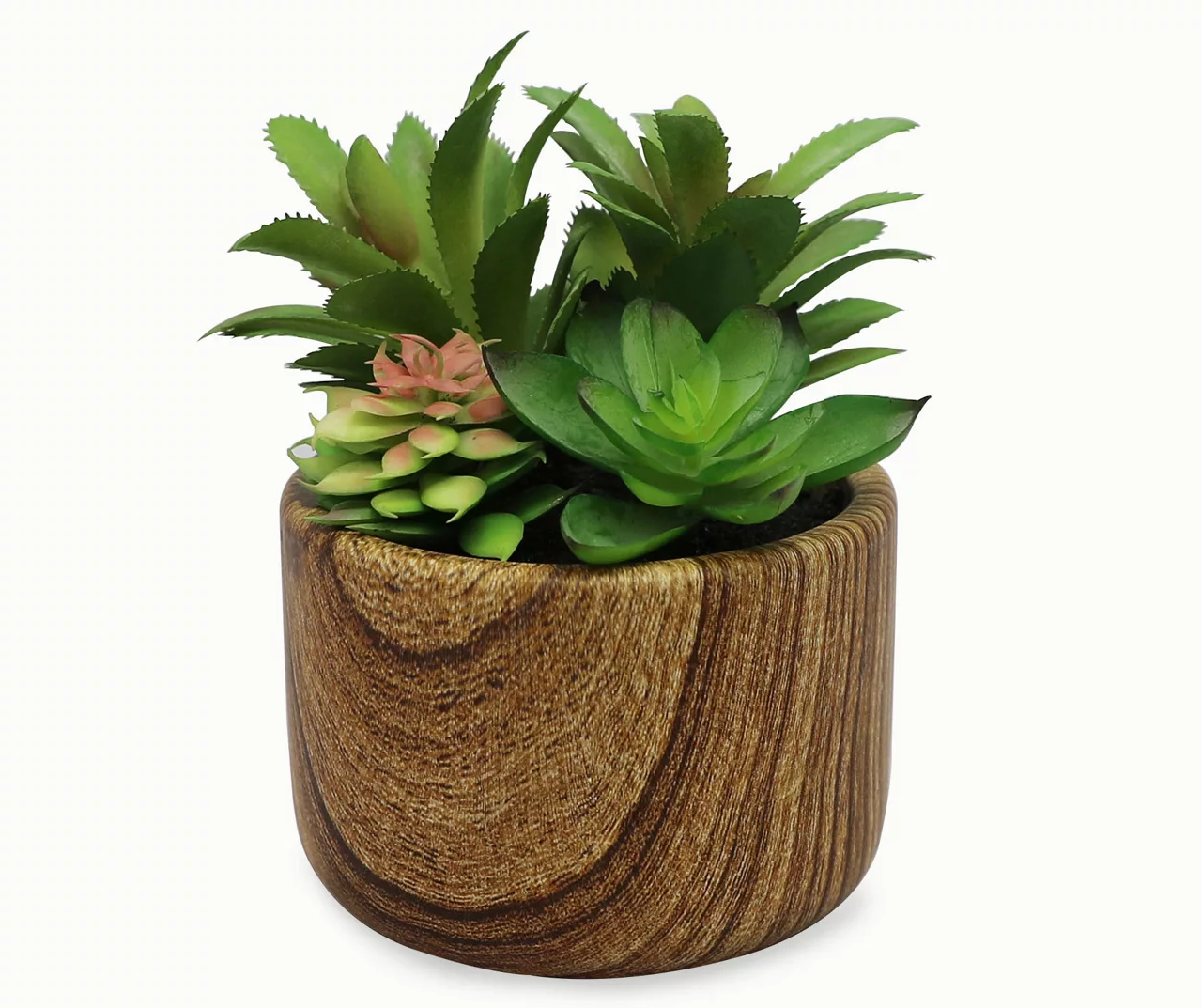 This lifelike succulent bouquet brings all the beauty of a desert garden oasis to your tabletop. Classic rosettes of echeverias and aeoniums are artfully arranged in a round wood pot.
