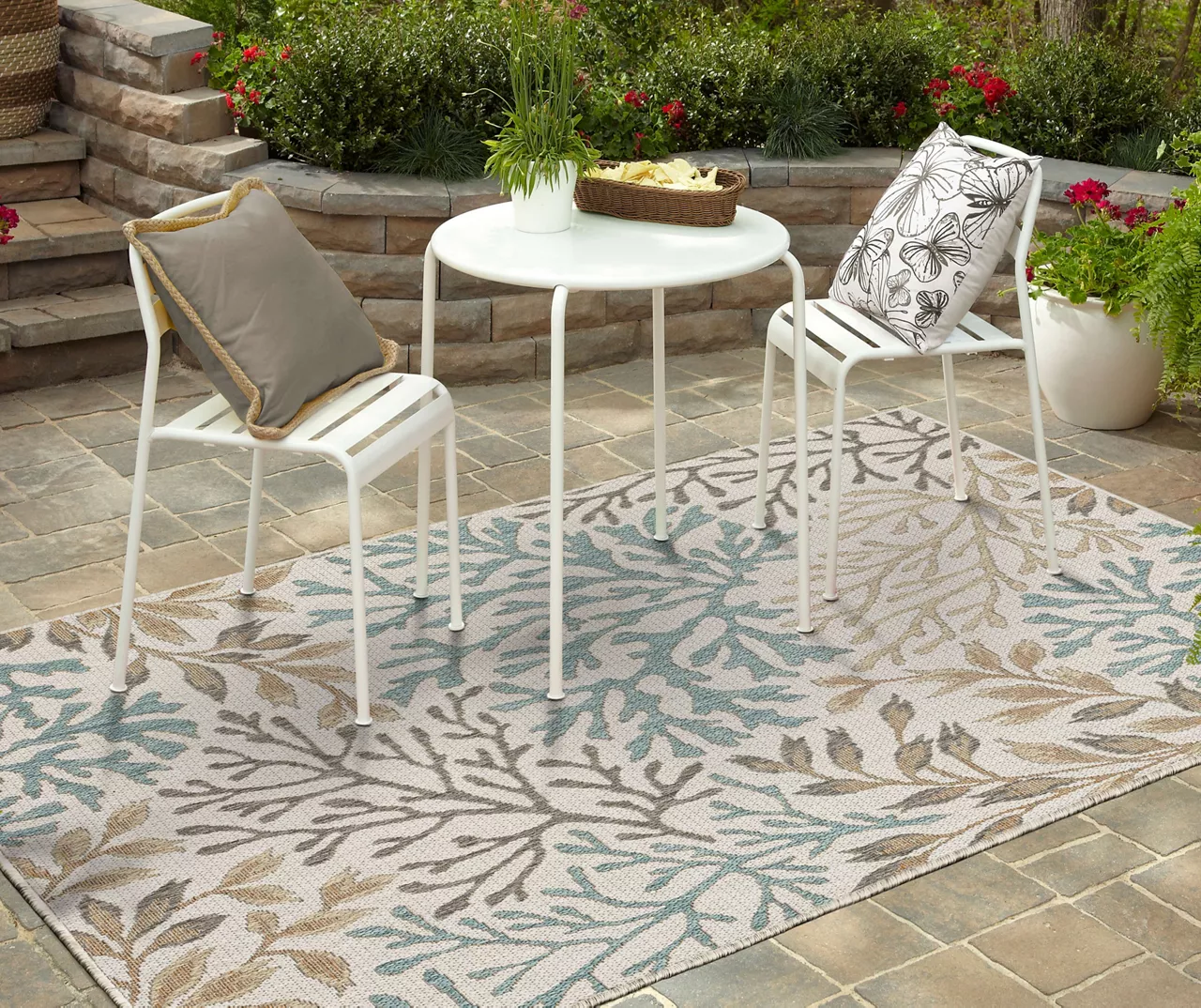The Mohawk Home Coastal Cove area rug features a coastal design in subtle palette of cream, turquoise and brown that easily complements your decor. Made with all-weather olefin polypropylene yarn, this flatwoven area rug offers a detailed design, soft feel and dependable durability that works in both indoor and outdoor spaces. The resilient surface fibers are resistant to stains, fading and moisture, making it a great choice for high-traffic areas.