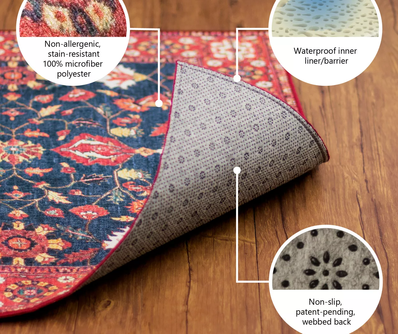 - Exclusive patent pending rug has a non-slip backing (no separate pad needed)