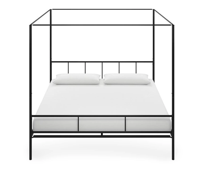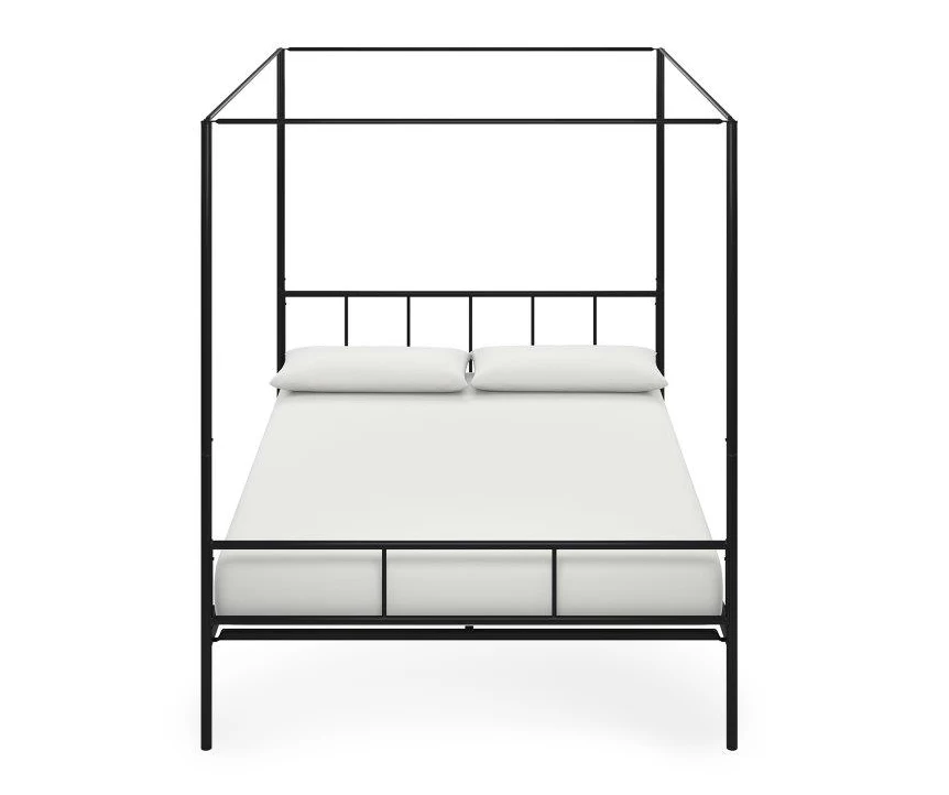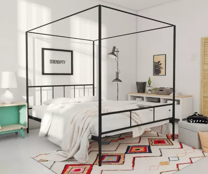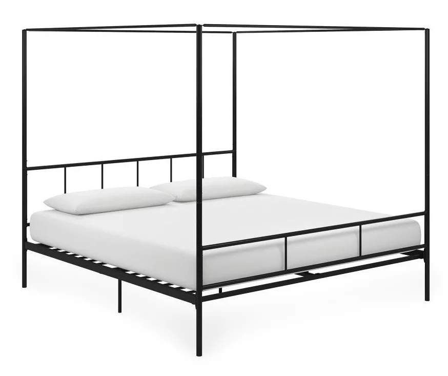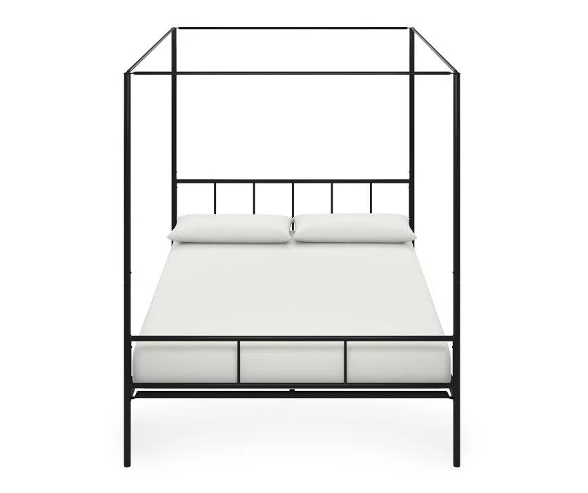 The Novogratz Marion canopy bed is stylish and classy. Designed with a clean silhouette, this eye-catching piece is crafted in solid and sturdy metal that is stable and durable with secure metal slats that do not require a foundation. It comes with a sophisticated headboard and footboard and with metal side rails and center legs to provide full support and comfort to you and your mattress. The Marion is also practical with 11″ of clearance beneath the bed, ideal to store things away.