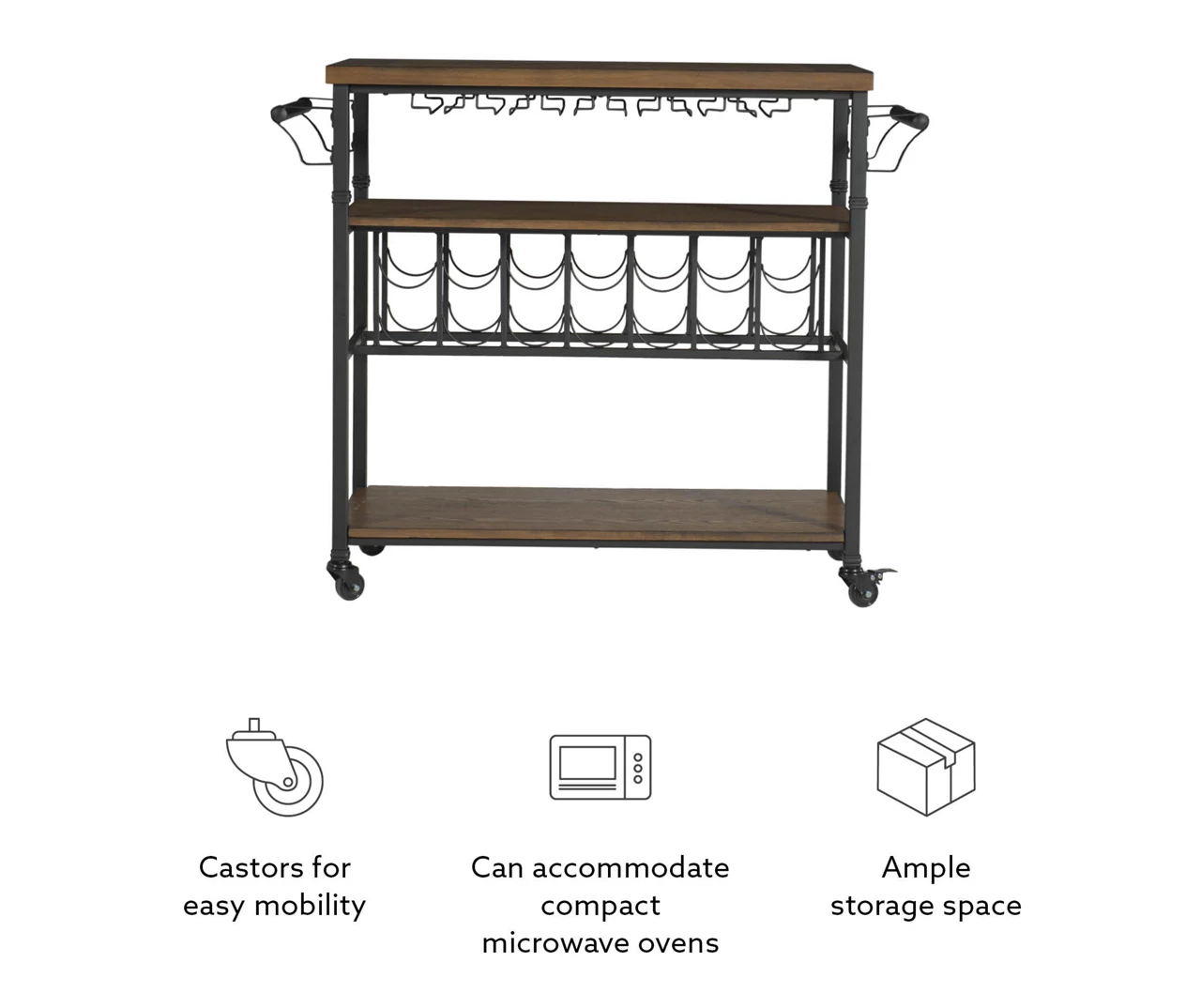Become the entertainer of your dreams with this handsome wine cart! This classic piece makes mixing a cocktail or serving canapes a breeze while keeping wine bottles and wine glasses safe and conveniently close. Gather family and friends around this piece for a wine tasting as you showcase your skills as a sommelier or add this cart to a kitchen for added workspace and storage. In any setting, this cart offers rugged beauty and endless functions.