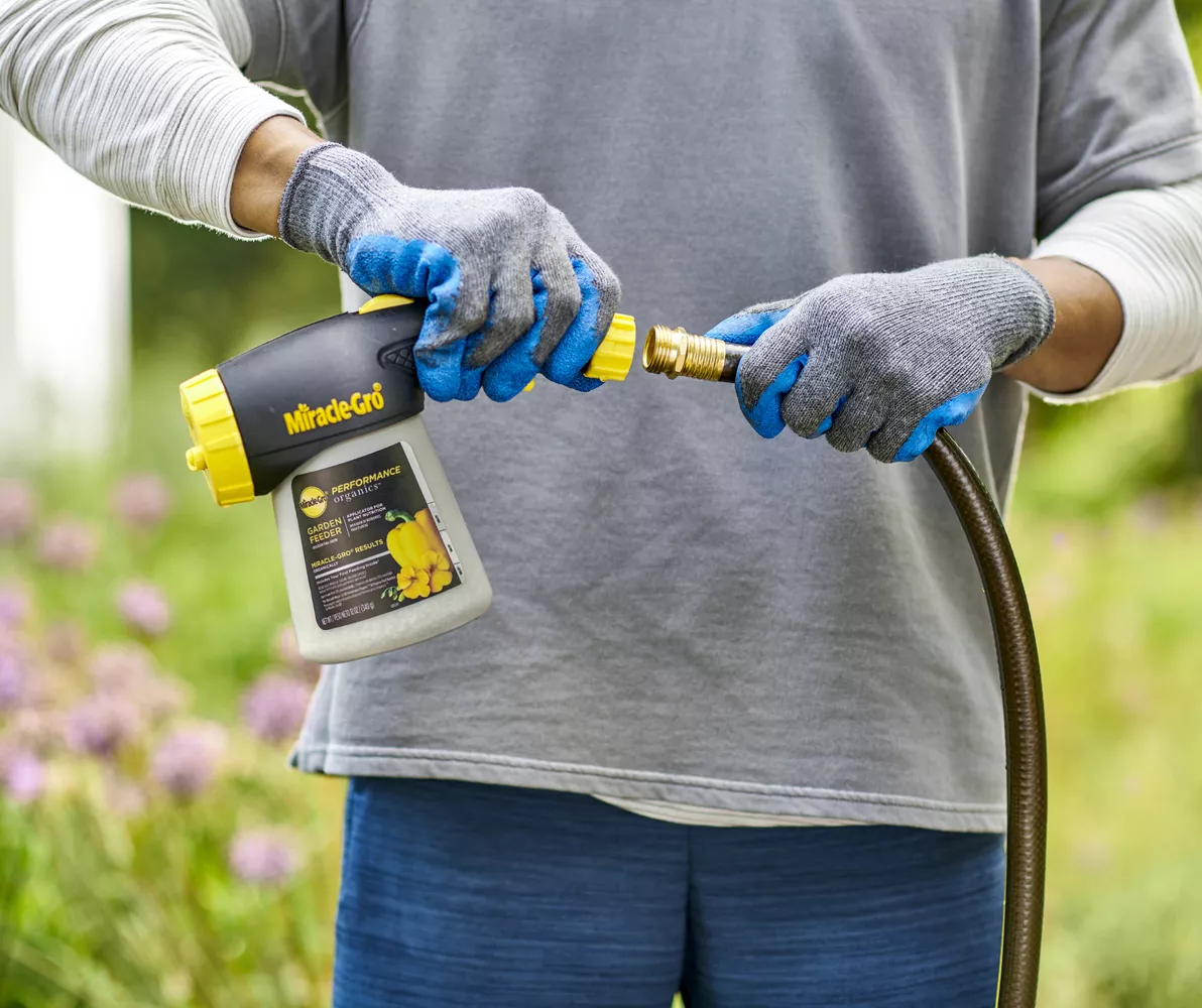 - Feeding your plants is easy with the Miracle-Gro Performance Organics Garden Feeder which attaches to any outdoor garden hose