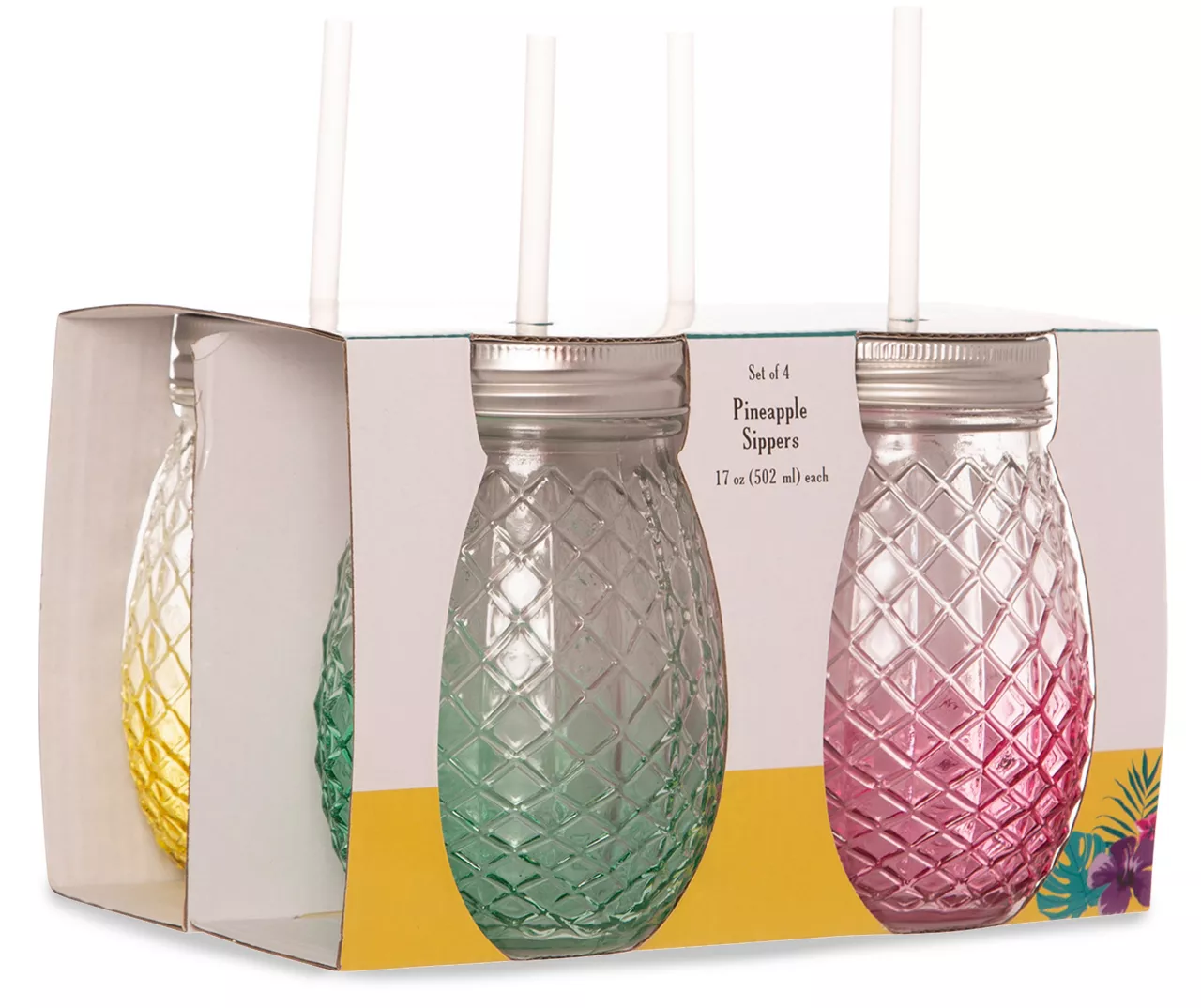 Bring tropical vibes to your drinkware collection with this set of festive pineapple sippers. Each jar is shaped like the fruit in an ombré design. Complete with screw-on lids and straws, these glasses are perfect for summertime cocktails, iced tea, water and more.