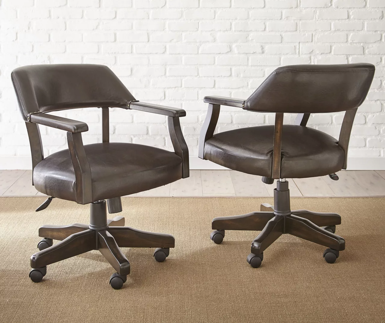 The impressive Rudy captain’s chair features solid wood construction in a medium walnut finish. The pedestal base features five casters for mobility. Comfortable padded seats and backs upholstered are in an easy-to-clean durable dark brown vinyl. The chair arms are accented with a touch of nailhead trim completing the look.