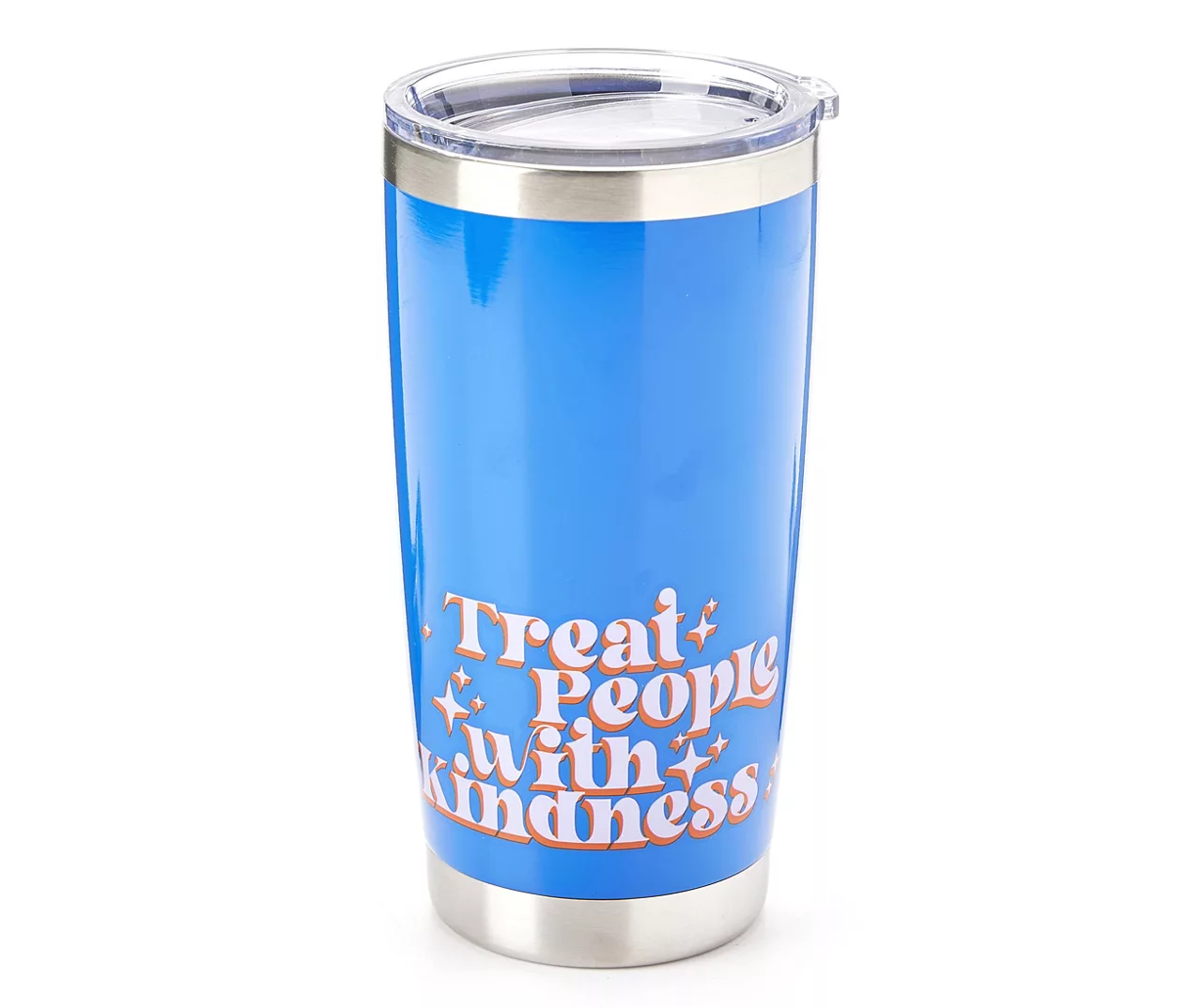 Lend daily positivity to every sip with this uplifting travel tumbler made from durable stainless steel. Thanks to the clear lid and insulated body, this tumbler is perfect for hot beverages on the go. The inspiring “treat people with kindness” message provides a perfect pop of positivity to your day whether you’re running errands or relaxing at home.