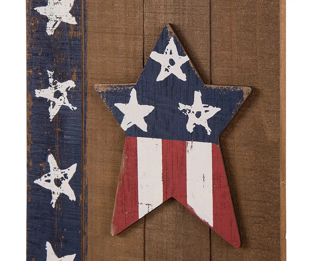 Welcome guests and commemorate Fourth of July in patriotic fan fare and perch this large sign on your porch or backyard patio. It features bright red, white and blue cut-out letters so large you can read them from the street. Perfect for hanging on your front door or covered porch.